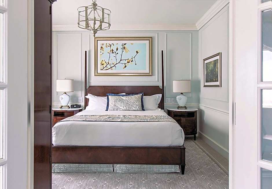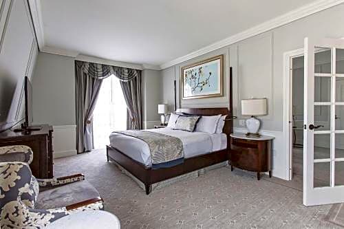 This room includes a reading area accented with original art, a private bathroom with Italian marble vanities, and a walk-in shower or soaking tub with shower combination. A private balcony is provided as well.