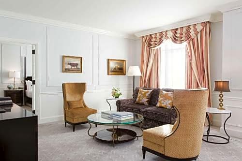 This suite features a seating area with a sofa bed and original artwork. An private bathroom with Italian marble vanities, storage space, and walk-in rain shower or soaking bathtub is included as is master-controlled lighting and a small refrigerator.
