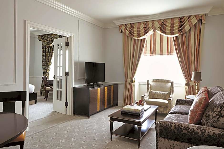 This suite features a spacious seating area with a sofa bed and a flat-screen TV. An private bathroom with Italian marble vanities, storage space, and walk-in rain shower or soaking bathtub is included. The dining table can seat 4 guests.
